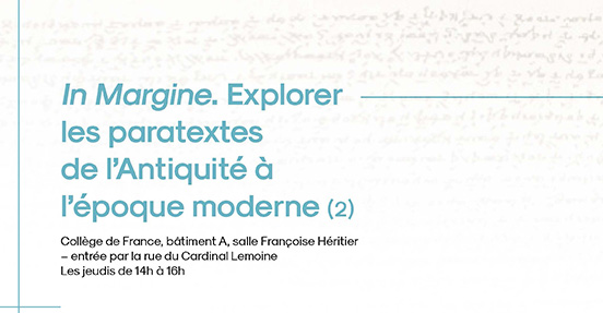 - [Séminaire] In Margine. Explorer les paratextes de l'Antiquité à l'époque moderne (2)2 octobre 2025 - 11 juin 2026Séminaire Organisé par Francesca P. Barone (CNRS, Orient et Méditerranée), Victor Gysembergh (CNRS, Centre Léon Robin), Luciano Piffanelli (Université de Haute-Alsace etCentre Jean-Mabillon - ENC), Arnaud Perrot (Université de Tours, CESR, IUF), Giusto Traina (Sorbonne Université)